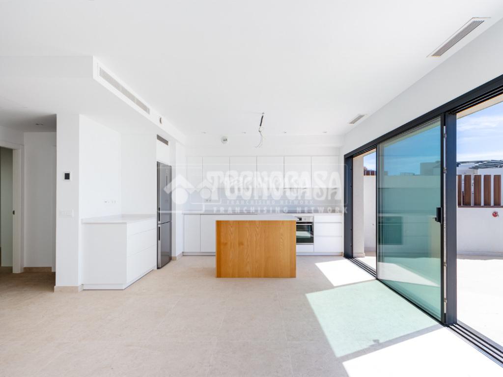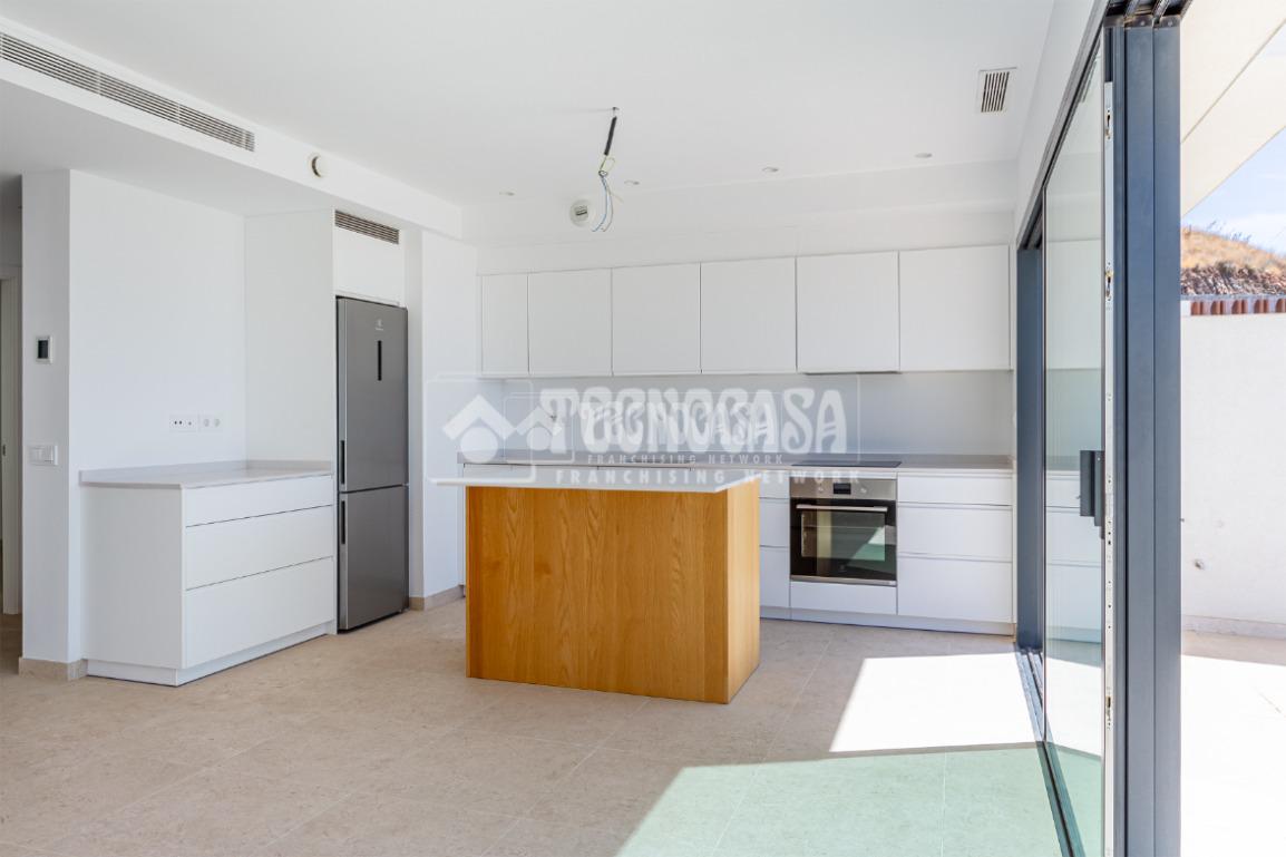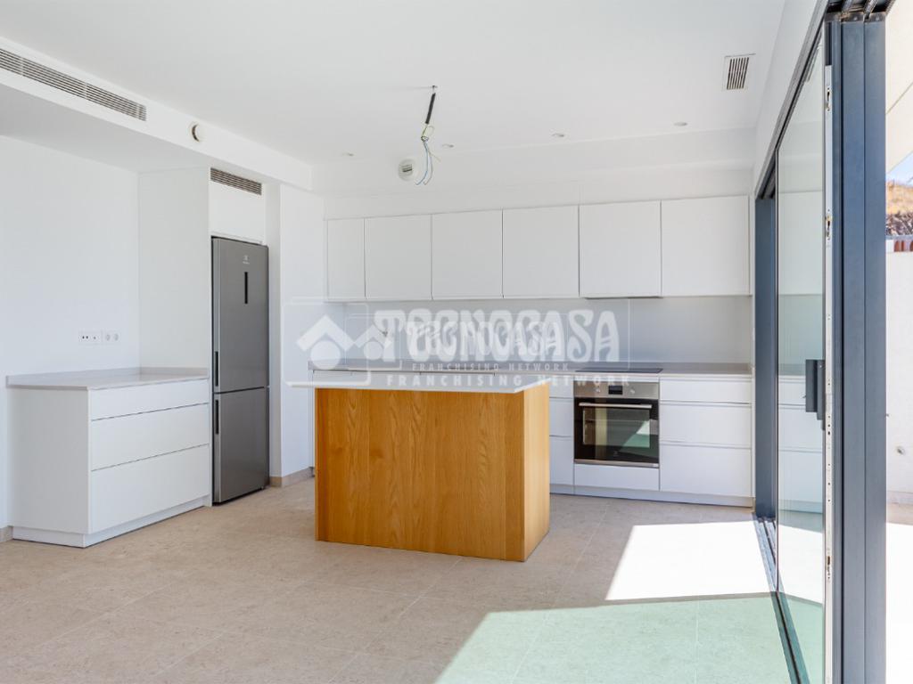 - El corazón de la vivienda es un amplio espacio abierto que integra salón y cocina, con grandes ventanales que permiten la entrada de luz natural durante todo el día.